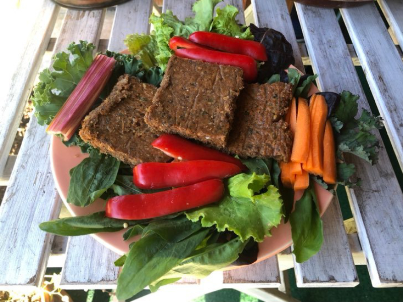 Ebédre „bot” és nyers zöldség szeletelve. A „bot” nem más, mint teljes kiőrlésű tönkölyliszt összekeverve vízzel, kis kókuszzsírral, reszelt káposztával, hagymával, zöldfűszerekkel, tésztává gyúrva, aztán kinyújtva tepsiben, és felcsíkozva, kisütve. Természetesen a „bot” tetszés szerint fűszerezhető: volt, hogy mángold levél volt benne meg medvehagyma, volt, hogy csalán. Bármit bele lehet sütni ami zöldségféle (előző maradékok elrejtése), csak le kell reszelni, vagy apróra vágni.