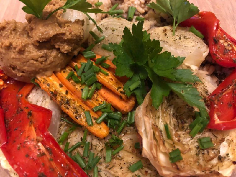 Ebédre kókuszzsírral kikent tepsiben sült zöldség, olivaolajba áztatott fűszerekkel megkenve sütés előtt.